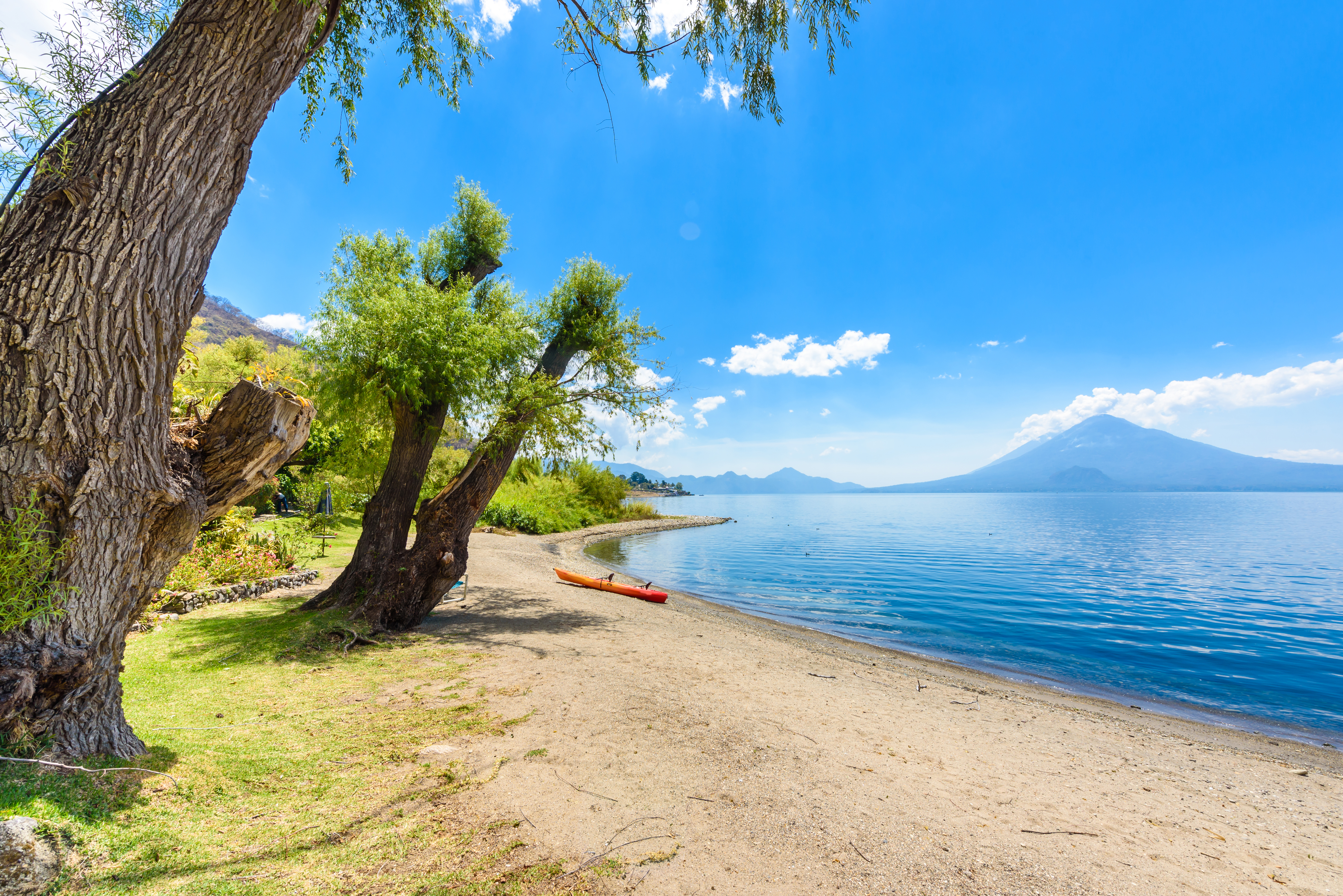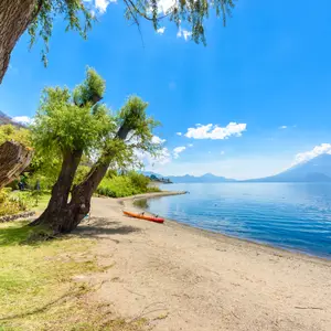 À deux heures d’Antigua, on trouve l’un des plus beaux joyaux du Guatemala : le lac Atitlán. Il se situe au cœur d’une chaîne de volcans à 1 500 mètres d’altitude et ressemble à un immense miroir constellé de bleus. Sur le bord des rives, les femmes vous initieront à l’art du tissage tandis que les hommes vous dévoileront leurs impressionnantes sculptures en bois et/ou leurs toiles : un circuit immersif au cœur de la culture guatémaltèque.