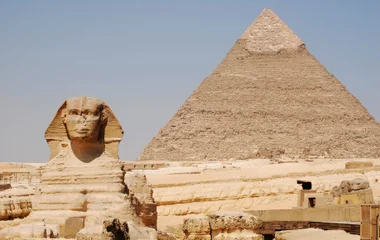 Cette statue gigantesque se compose d’une tête humaine et d’un corps de lion allongé. Elle se dresse sur le plateau de Gizeh, au sud du Caire, à proximité des pyramides. Un symbole fort, le cobra, est apparent sur le front du Sphinx de Gizeh qui subit l’érosion du temps. Les éléments manquants au nez et à la bouche sont les conséquences de tirs survenus au Moyen-Âge.
