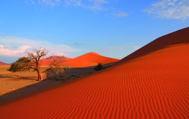 Selon l’heure du jour, les géants de sable se parent d’une couleur différente, allant du rouge flamboyant au rose, et semblent tout droit surgis d’une autre planète. À leurs côtés se dressent des arbres centenaires, dont les tons verts forment un très joli contraste avec les coloris à l’entour du désert du Namib.